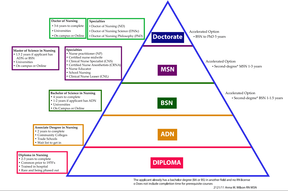 The Levels of Nursing Pyramid above shows how nursing degrees progress from diploma and associate degrees to advanced degrees like bachelor of science in nursing, master of nursing, and doctorate of nursing. Check out this post if you want to know how long it takes to become a nurse.